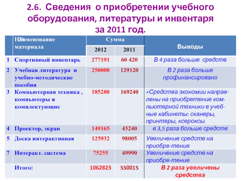 Слайд 212.6. Сведения о приобретении учебного оборудования, литературы и инвентаря