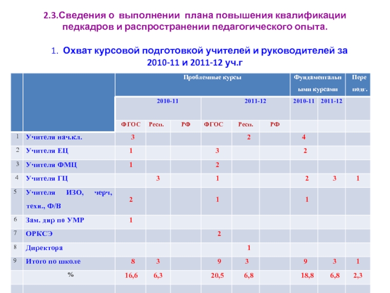 Слайд 182.3.Сведения о выполнении плана повышения квалификации педкадров и распространении педагогического опыта.