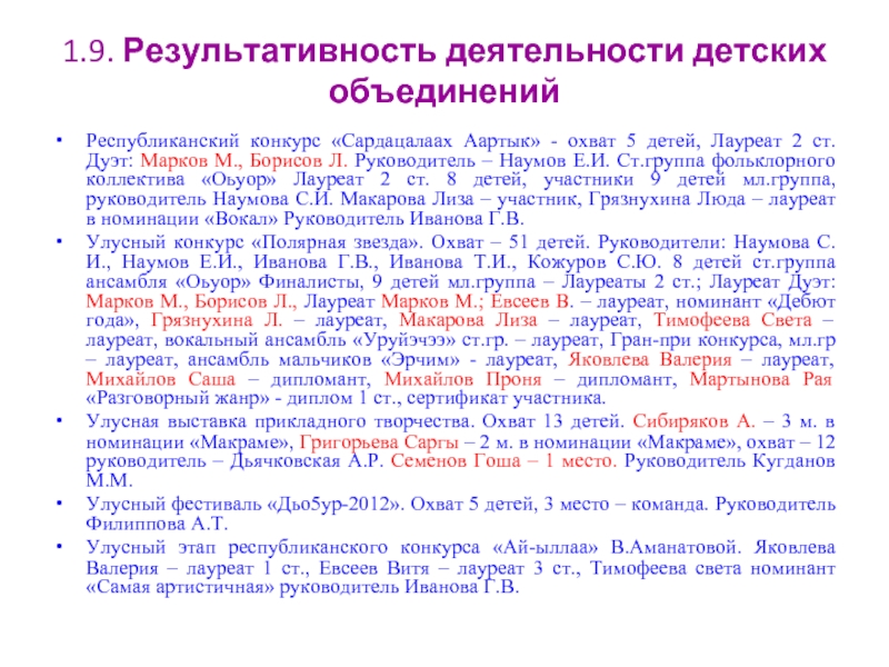 детей, Лауреат 2 ст. Дуэт: Марков М., Борисов Л. Руководитель – Наумов Е.И. Ст.группа фольклорного коллектива «Оьуор» Лауреат 2 ст. 8 детей, участники 9 детей мл.группа, руководитель Наумова С.И. Макарова Лиза – участник, Грязнухина Люда – лауреат в номинации «Вокал» Руководитель Иванова Г.В.