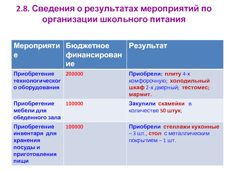 Слайд 232.8. Сведения о результатах мероприятий по организации школьного питания