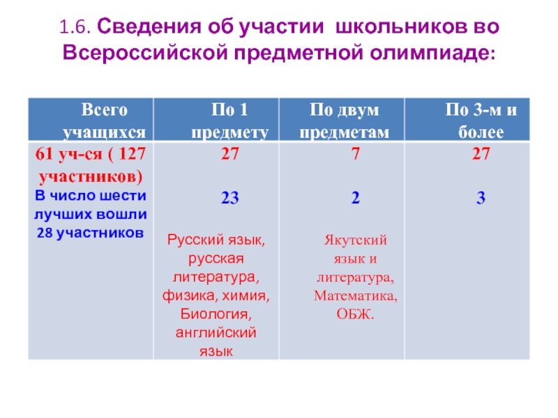 Слайд 81.6. Сведения об участии школьников во Всероссийской предметной олимпиаде: