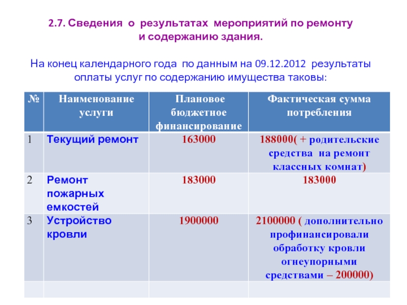 Слайд 222.7. Сведения о результатах мероприятий по ремонту