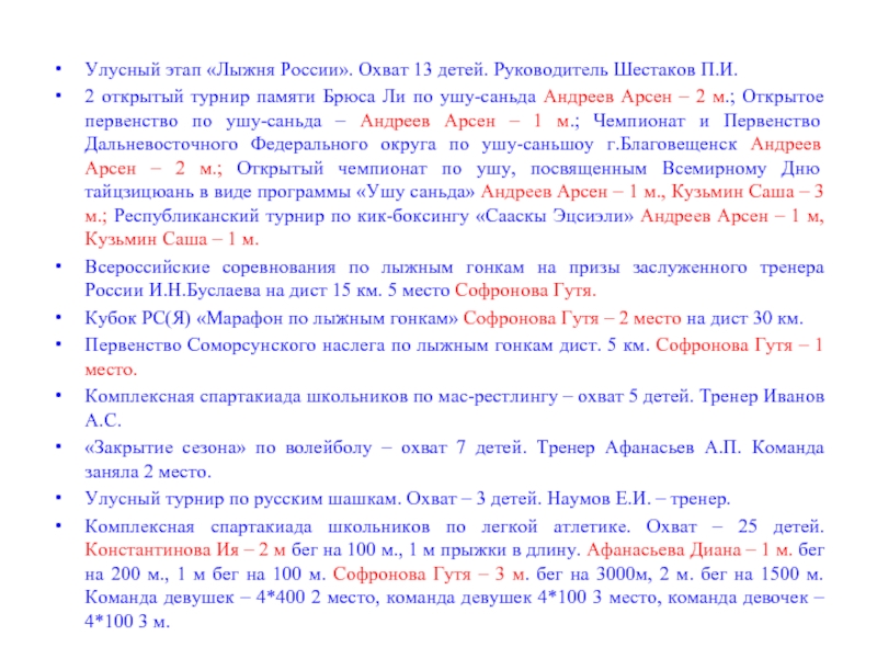 Слайд 14Улусный этап «Лыжня России». Охват 13 детей. Руководитель Шестаков П.И.