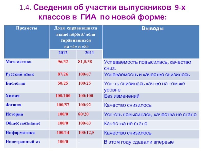 Слайд 61.4. Сведения об участии выпускников 9-х классов в ГИА по новой