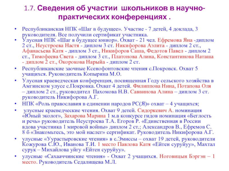 Слайд 91.7. Сведения об участии школьников в научно-практических конференциях .