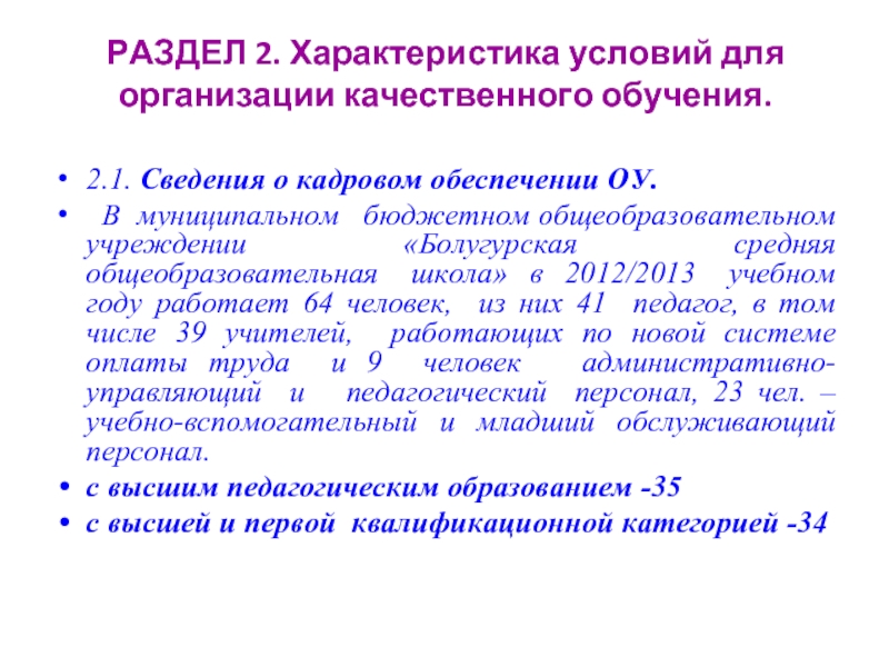 Слайд 16РАЗДЕЛ 2. Характеристика условий для организации качественного обучения.