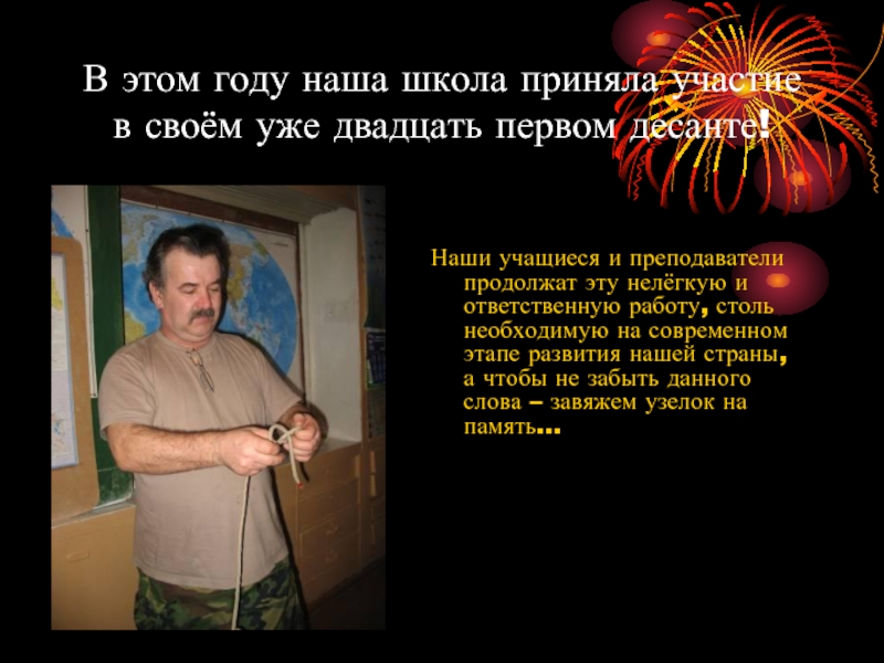 Наши учащиеся и преподаватели продолжат эту нелёгкую и ответственную работу, столь необходимую на современном этапе развития нашей страны, а чтобы не забыть данного слова – завяжем узелок на память…