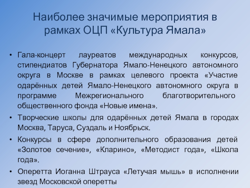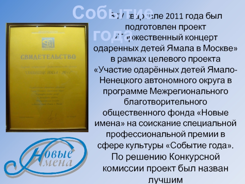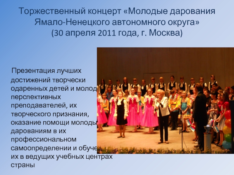 Презентация лучших достижений творчески одаренных детей и молодежи и перспективных преподавателей, их творческого признания, оказание помощи молодым дарованиям в их профессиональном самоопределении и обучении их в ведущих учебных центрах страны
