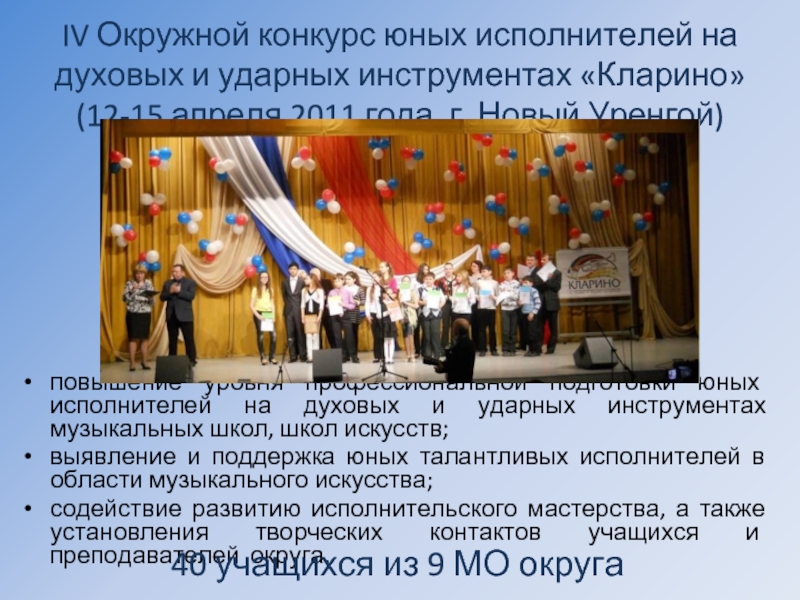 содействие развитию исполнительского мастерства, а также установления творческих контактов учащихся и преподавателей округа.