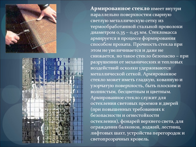 термообработанной стальной проволоки диаметром 0,35 – 0,45 мм. Стекломасса армируется в процессе формирования способом проката. Прочность стекла при этом не увеличивается и даже не снижается, но такое стекло безопасно – при разрушении от механических и тепловых воздействий осколки удерживаются металлической сеткой. Армированное стекло может иметь гладкую, кованную и узорчатую поверхность, быть плоским и волнистым, бесцветным и цветным. Армированное стекло служит для остекления световых проемов и дверей (при повышенных требованиях к безопасности и огнестойкости остекления), фонарей верхнего света, для ограждения балконов, лоджий, лестниц, лифтовых шахт, устройства перегородок и светопрозрачных кровель.