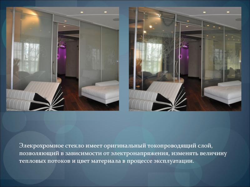 Слайд 14Элекрохромное стекло имеет оригинальный токопроводящий слой, позволяющий в зависимости от электронапряжения,