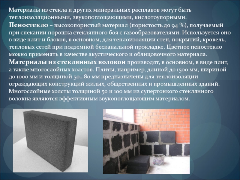 Слайд 29Материалы из стекла и других минеральных расплавов могут быть теплоизоляционными, звукопоглощающими,