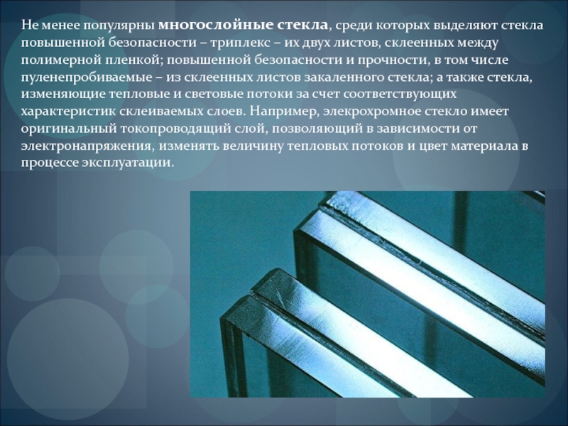 Слайд 13Не менее популярны многослойные стекла, среди которых выделяют стекла повышенной безопасности