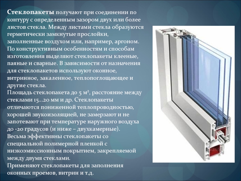 более листов стекла. Между листами стекла образуются герметически замкнутые прослойки, заполненные воздухом или, например, аргоном. По конструктивным особенностям и способам изготовления выделяют стеклопакеты клееные, паяные и сварные. В зависимости от назначения для стеклопакетов используют оконное, витринное, закаленное, теплопоглощающее и другие стекла.