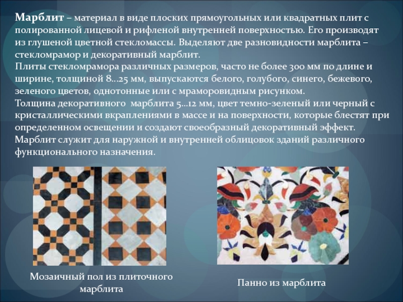 Слайд 22Марблит – материал в виде плоских прямоугольных или квадратных плит с