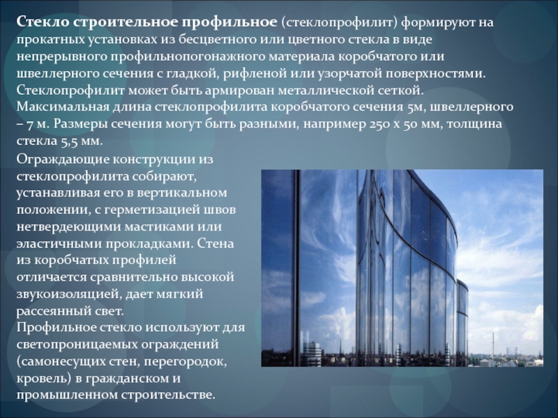 цветного стекла в виде непрерывного профильнопогонажного материала коробчатого или швеллерного сечения с гладкой, рифленой или узорчатой поверхностями. Стеклопрофилит может быть армирован металлической сеткой. Максимальная длина стеклопрофилита коробчатого сечения 5м, швеллерного – 7 м. Размеры сечения могут быть разными, например 250 x 50 мм, толщина стекла 5,5 мм.
