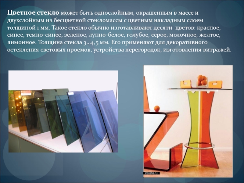 Слайд 9Цветное стекло может быть однослойным, окрашенным в массе и двухслойным из