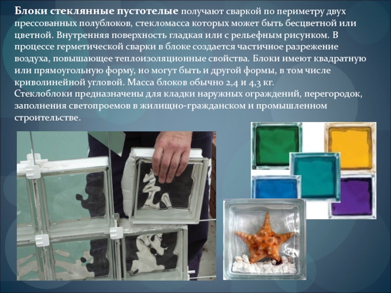 Слайд 15Блоки стеклянные пустотелые получают сваркой по периметру двух прессованных полублоков, стекломасса