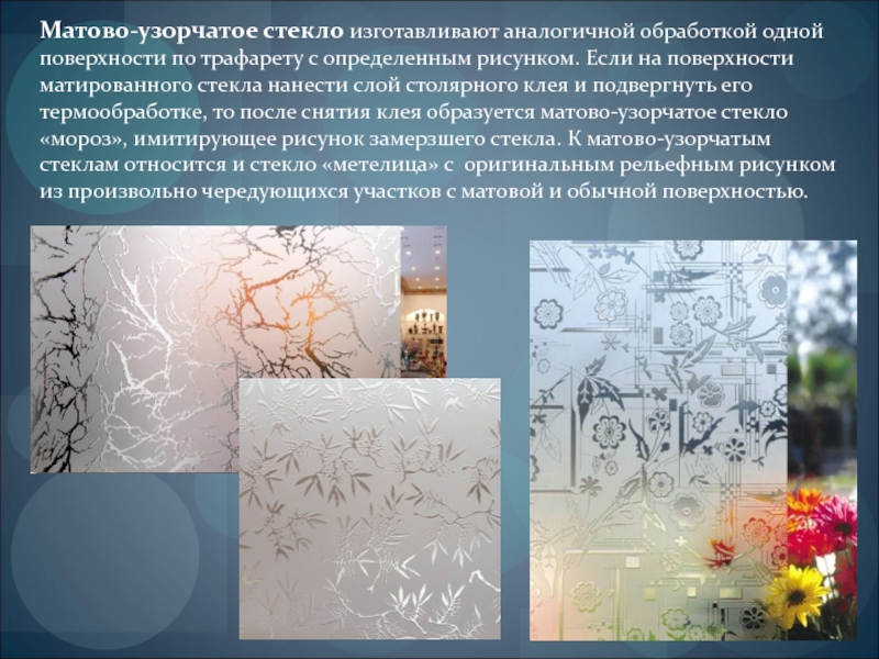 рисунком. Если на поверхности матированного стекла нанести слой столярного клея и подвергнуть его термообработке, то после снятия клея образуется матово-узорчатое стекло «мороз», имитирующее рисунок замерзшего стекла. К матово-узорчатым стеклам относится и стекло «метелица» с оригинальным рельефным рисунком из произвольно чередующихся участков с матовой и обычной поверхностью.