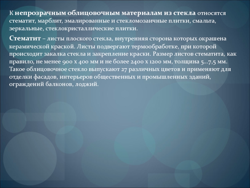 Слайд 21К непрозрачным облицовочным материалам из стекла относятся стематит, марблит, эмалированные и
