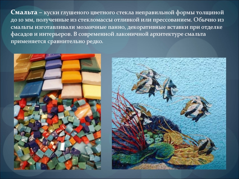 Слайд 24Смальта – куски глушеного цветного стекла неправильной формы толщиной до 10
