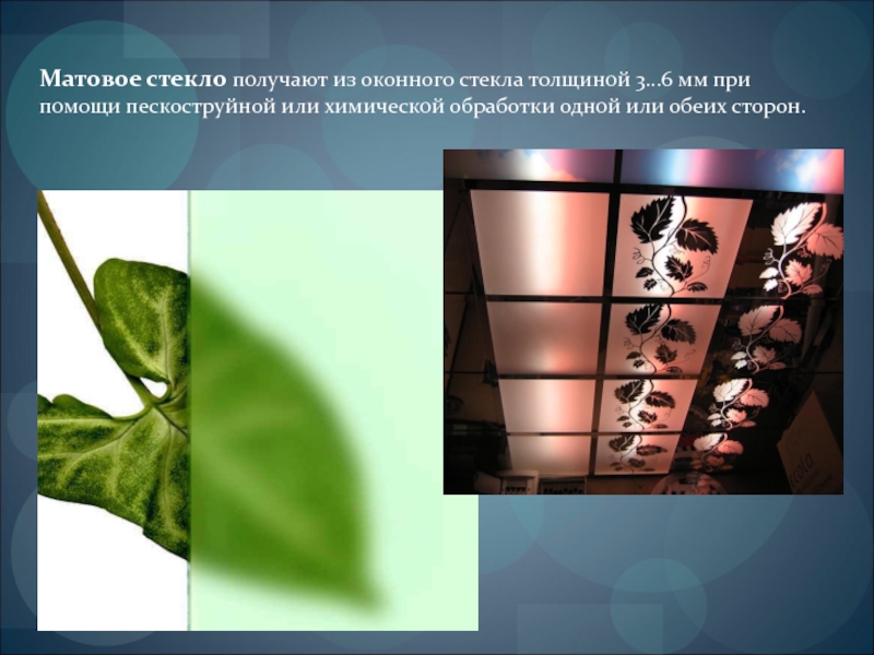 Слайд 7Матовое стекло получают из оконного стекла толщиной 3…6 мм при помощи