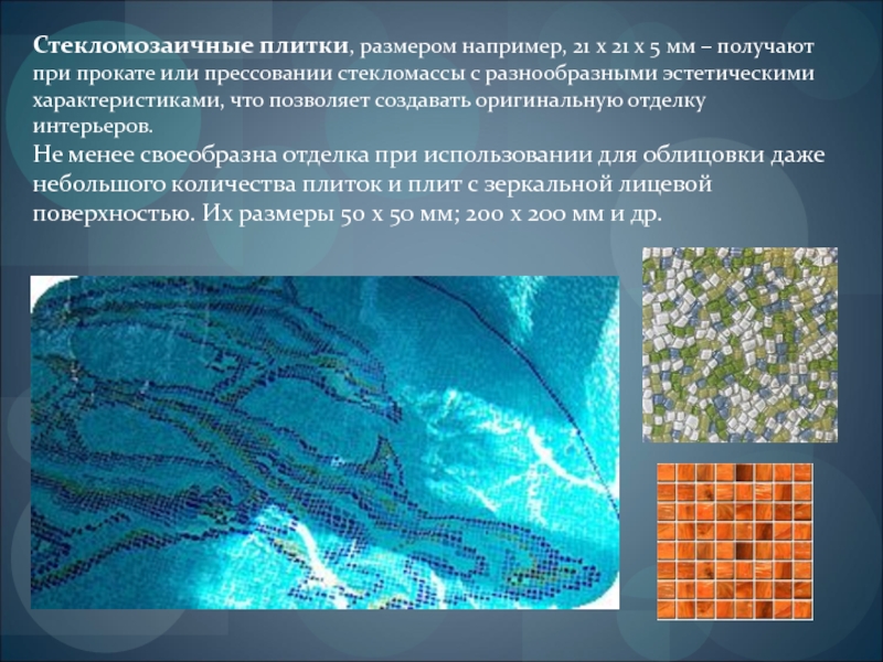 Слайд 26Стекломозаичные плитки, размером например, 21 x 21 x 5 мм –