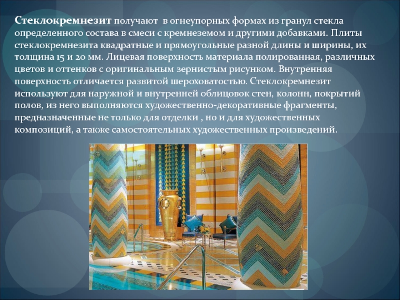 смеси с кремнеземом и другими добавками. Плиты стеклокремнезита квадратные и прямоугольные разной длины и ширины, их толщина 15 и 20 мм. Лицевая поверхность материала полированная, различных цветов и оттенков с оригинальным зернистым рисунком. Внутренняя поверхность отличается развитой шероховатостью. Стеклокремнезит используют для наружной и внутренней облицовок стен, колонн, покрытий полов, из него выполняются художественно-декоративные фрагменты, предназначенные не только для отделки , но и для художественных композиций, а также самостоятельных художественных произведений.
