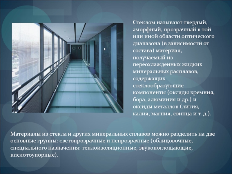Материалы из стекла и других минеральных сплавов можно разделить на две основные группы: светопрозрачные и непрозрачные (облицовочные, специального назначения: теплоизоляционные, звукопоглощающие, кислотоупорные).
