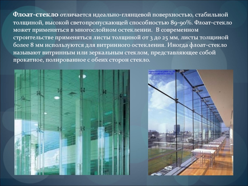 Слайд 5Флоат-стекло отличается идеально-глянцевой поверхностью, стабильной толщиной, высокой светопропускающей способностью 89-90%. Флоат-стекло