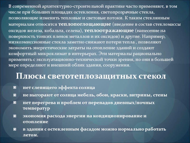 площадях остекления, светопрозрачные стекла, позволяющие изменять тепловые и световые потоки. К таким стеклянным материалам относятся теплопоглощающие (введение в состав стекломассы оксидов железа, кобальта, селена), теплоотражающие (нанесение на поверхность тонких пленок металлов и их оксидов) и другие. Например, низкоэмиссионные стекла заметно снижают потери тепла , позволяют экономить энергетические затраты на отопление зданий и создают комфортный микроклимат в интерьерах. Эти материалы рационально применять с эксплуатационно-технической точки зрения, но они в большей мере определяют и внешний облик здания, сооружения.