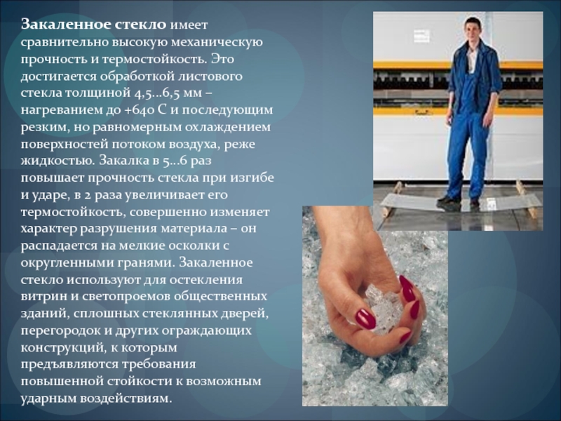 Слайд 11Закаленное стекло имеет сравнительно высокую механическую прочность и термостойкость. Это достигается
