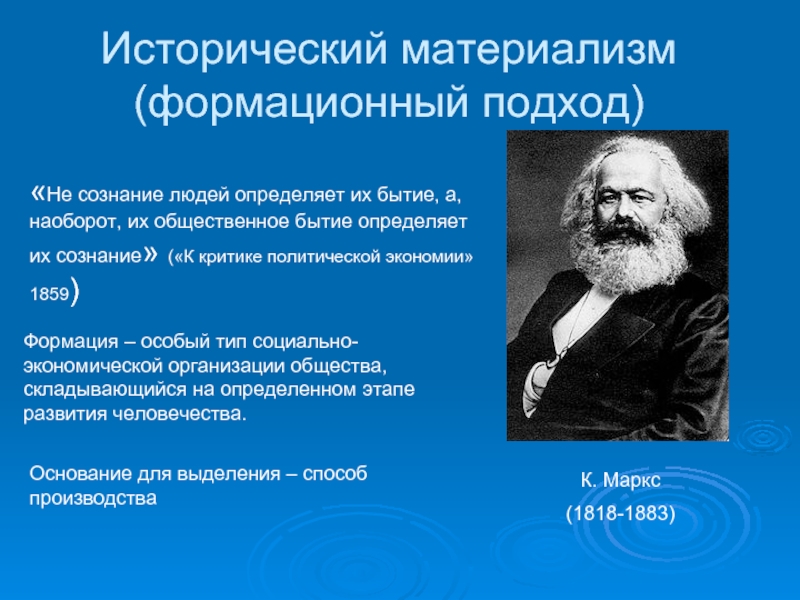 «Не сознание людей определяет их бытие, а, наоборот, их общественное бытие определяет их сознание» («К критике политической экономии» 1859)