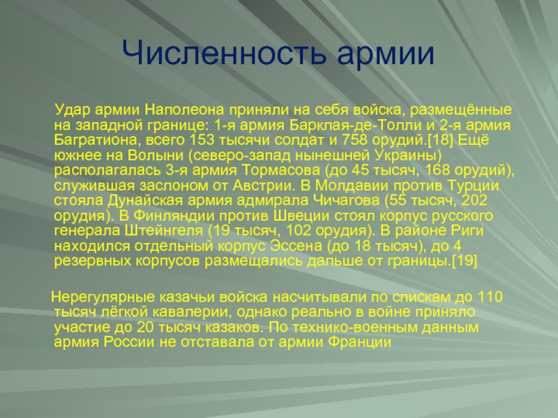 размещённые на западной границе: 1-я армия Барклая-де-Толли и 2-я армия Багратиона, всего 153 тысячи солдат и 758 орудий.[18] Ещё южнее на Волыни (северо-запад нынешней Украины) располагалась 3-я армия Тормасова (до 45 тысяч, 168 орудий), служившая заслоном от Австрии. В Молдавии против Турции стояла Дунайская армия адмирала Чичагова (55 тысяч, 202 орудия). В Финляндии против Швеции стоял корпус русского генерала Штейнгеля (19 тысяч, 102 орудия). В районе Риги находился отдельный корпус Эссена (до 18 тысяч), до 4 резервных корпусов размещались дальше от границы.[19]