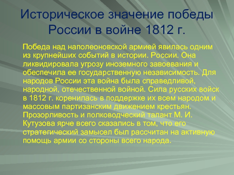 Слайд 12Историческое значение победы России в войне 1812 г.