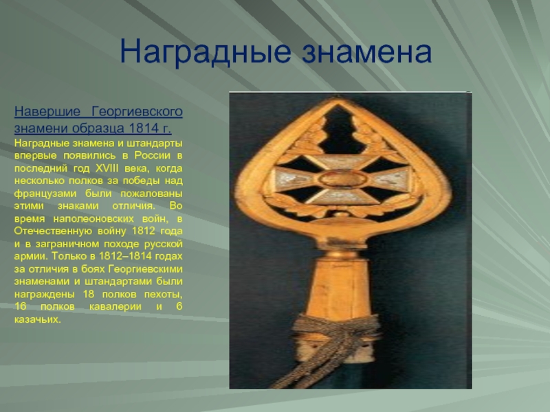 появились в России в последний год XVIII века, когда несколько полков за победы над французами были пожалованы этими знаками отличия. Во время наполеоновских войн, в Отечественную войну 1812 года и в заграничном походе русской армии. Только в 1812–1814 годах за отличия в боях Георгиевскими знаменами и штандартами были награждены 18 полков пехоты, 16 полков кавалерии и 6 казачьих.