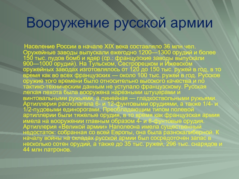 составляло 36 млн чел. Оружейные заводы выпускали ежегодно 1200—1300 орудий и более 150 тыс. пудов бомб и ядер (ср.: французские заводы выпускали 900—1000 орудий). На Тульском, Сестрорецком и Ижевском оружейных заводах изготовлялось от 120 до 150 тыс. ружей в год, в то время как во всех французских — около 100 тыс. ружей в год. Русское оружие того времени было относительно высокого качества и по тактико-техническим данным не уступало французскому. Русская легкая пехота была вооружена нарезными штуцерами и винтовальными ружьями, а линейная — гладкоствольными ружьями. Артиллерия располагала 6- и 12-фунтовыми орудиями, а также 1/4- и 1/2-пудовыми единорогами. Преобладающим типом полевой артиллерии были тяжелые орудия, в то время как французская армия имела на вооружении главным образом 4- и 8-фунтовые орудия. Артиллерия «Великой армии» Наполеона имела существенный недостаток: собранная со всей Европы, она была разнокалиберной. К началу войны на складах русской армии был сосредоточен запас в несколько сотен орудий, а также до 35 тыс. ружей, 296 тыс. снарядов и 44 млн патронов.