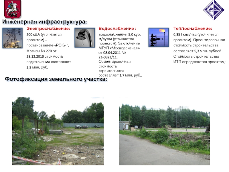 водоснабжение: 5,0 куб.м/сутки (уточняется проектом). Заключение МГУП «Мосводоканал» от 08.04.2011 № 21-0821/11. Ориентировочная стоимость строительства составляет 1,7 млн. руб..