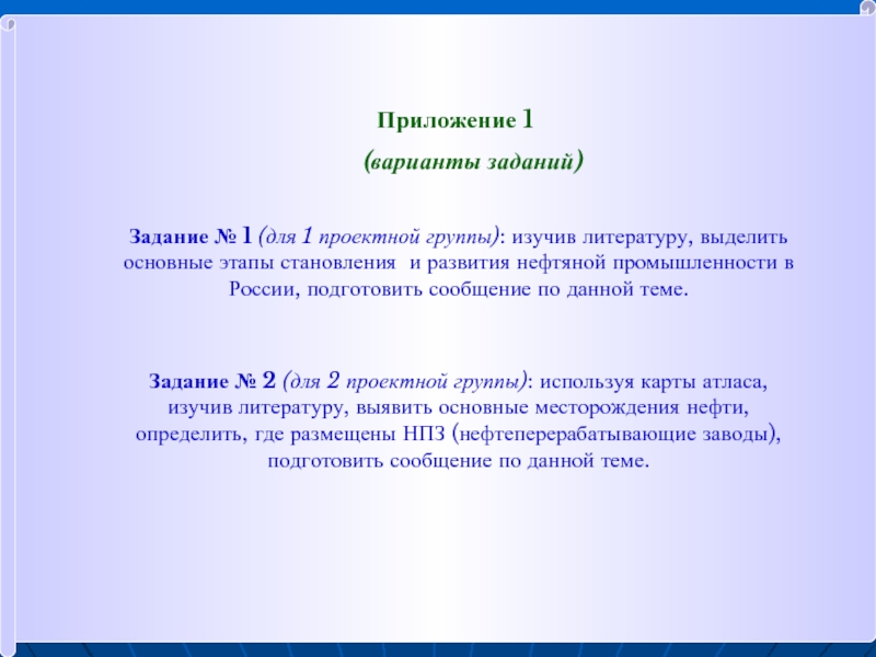 Задание № 2 (для 2 проектной группы): используя карты атласа, изучив литературу, выявить основные месторождения нефти, определить, где размещены НПЗ (нефтеперерабатывающие заводы), подготовить сообщение по данной теме.