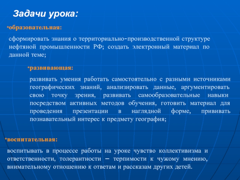 развивать умения работать самостоятельно с разными источниками географических знаний, анализировать данные, аргументировать свою точку зрения, развивать самообразовательные навыки посредством активных методов обучения, готовить материал для проведения презентации в наглядной форме, прививать познавательный интерес к предмету география;