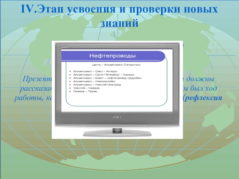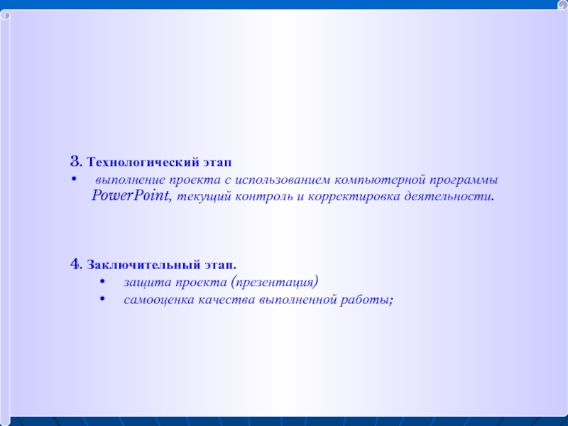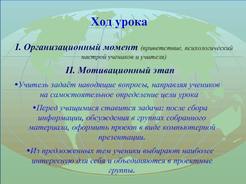 Перед учащимися ставится задача: после сбора информации, обсуждения в группах собранного материала, оформить проект в виде компьютерной презентации.