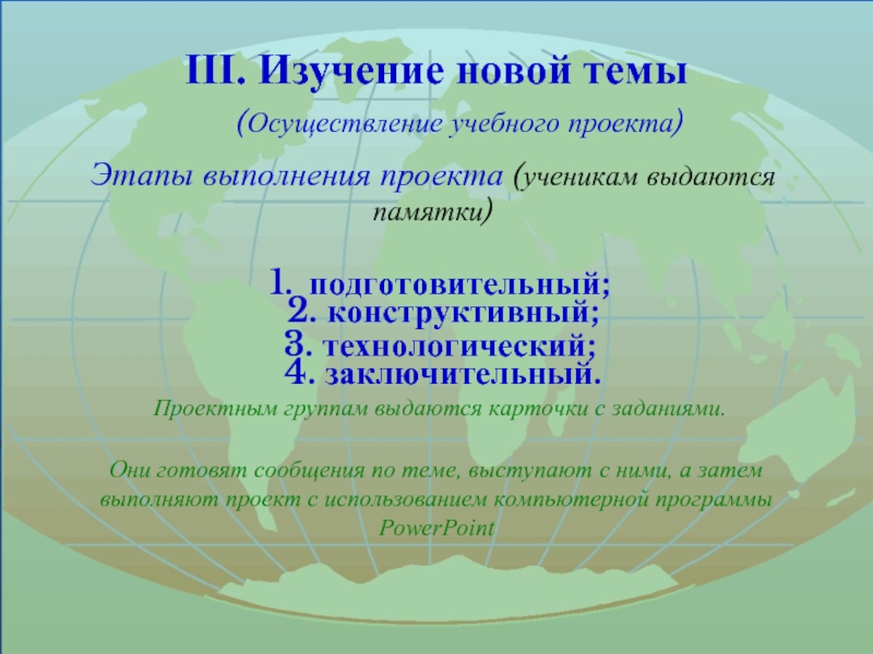 Они готовят сообщения по теме, выступают с ними, а затем выполняют проект с использованием компьютерной программы PowerPoint