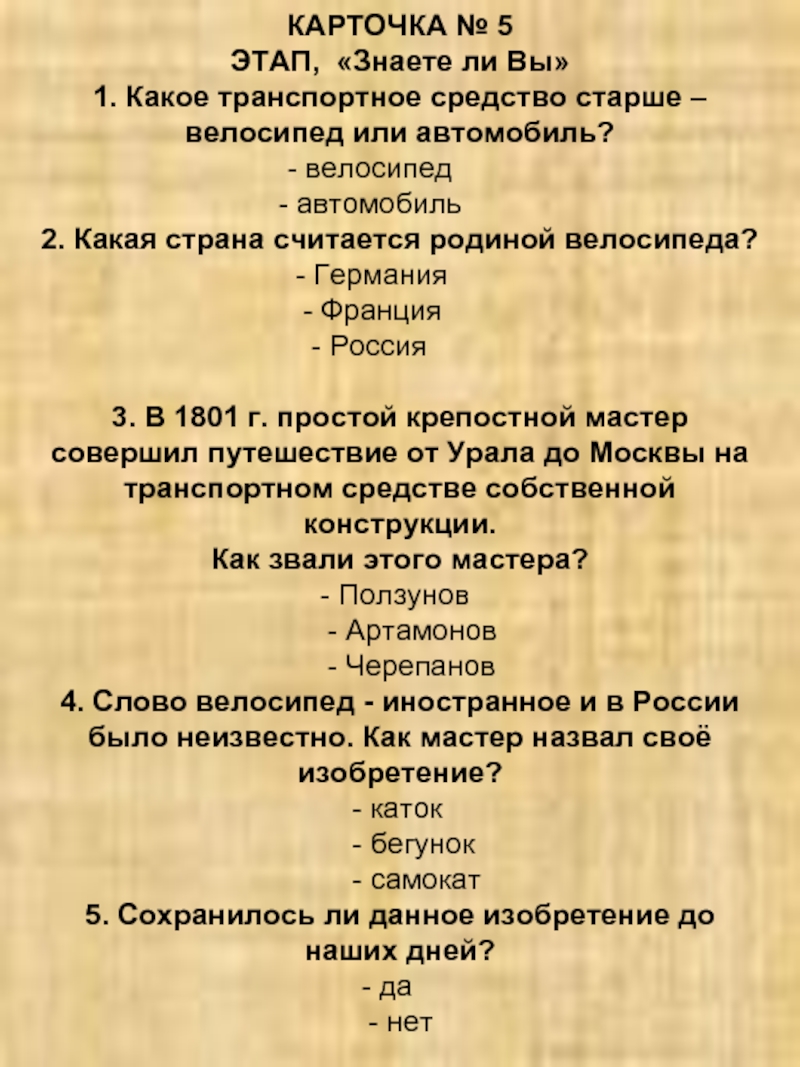 4. Слово велосипед - иностранное и в России было неизвестно. Как мастер назвал своё изобретение?