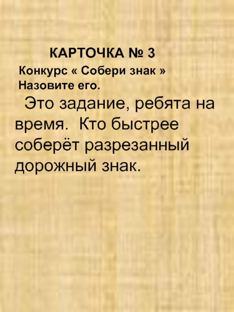 Это задание, ребята на время. Кто быстрее соберёт разрезанный дорожный знак.