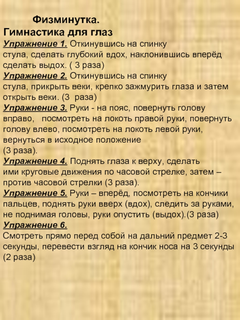 стула, прикрыть веки, крепко зажмурить глаза и затем открыть веки. (3 раза)