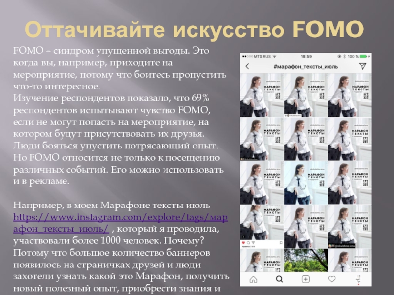 Изучение респондентов показало, что 69% респондентов испытывают чувство FOMO, если не могут попасть на мероприятие, на котором будут присутствовать их друзья. Люди бояться упустить потрясающий опыт.
