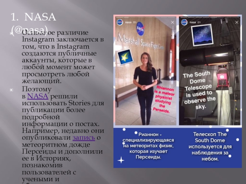 Поэтому в NASA решили использовать Stories для публикации более подробной информации о постах. Например, недавно они опубликовали запись о метеоритном дожде Персеиды и дополнили ее в Историях, познакомив пользователей с учеными и оборудованием.