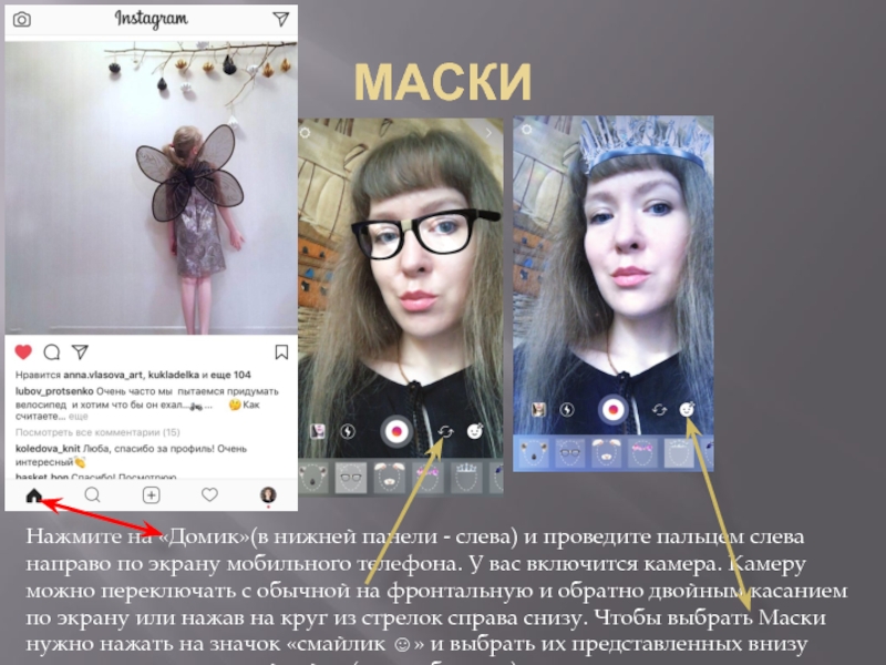 направо по экрану мобильного телефона. У вас включится камера. Камеру можно переключать с обычной на фронтальную и обратно двойным касанием по экрану или нажав на круг из стрелок справа снизу. Чтобы выбрать Маски нужно нажать на значок «смайлик ☺» и выбрать их представленных внизу вариантов – кроме ушей зайца (не для бизнеса)