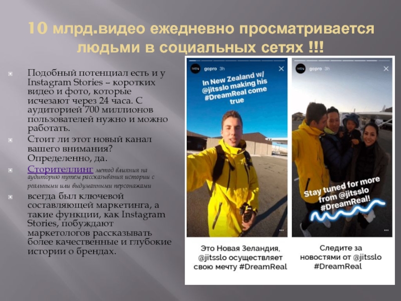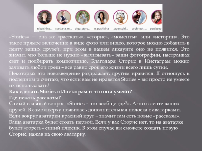 Слайд 3«Stories» — она же «рассказы», «сторис», «моменты» или «истории». Это такое