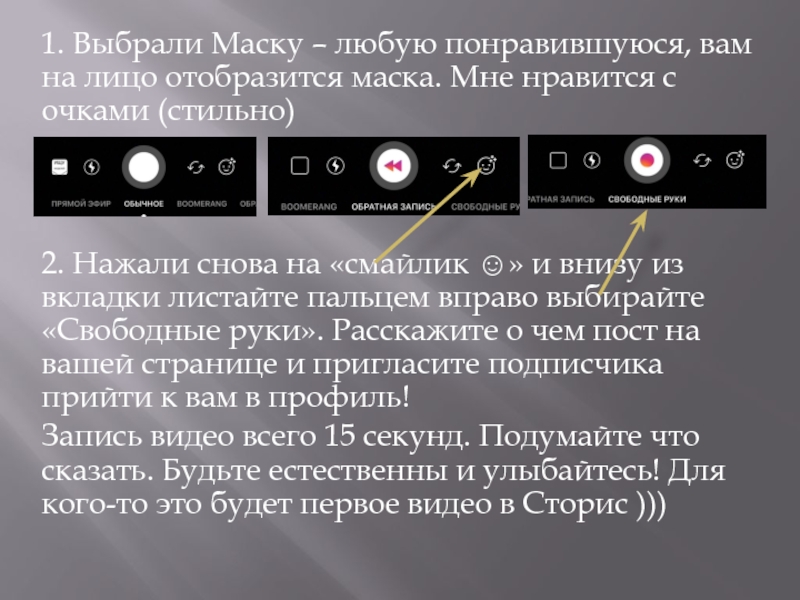 Запись видео всего 15 секунд. Подумайте что сказать. Будьте естественны и улыбайтесь! Для кого-то это будет первое видео в Сторис )))